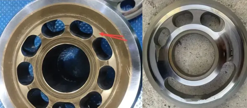 * **Size Failure:** The larger the diameter of the distributor plate, the more significant the cylinder tilting lever effect caused by spline clearance, swashplate step impact, and spindle bending, leading to more severe uneven wear on the low-pressure side.