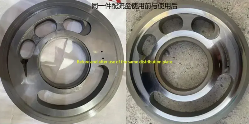 In the application of open hydraulic piston pumps, the distribution plate exhibits a typical asymmetric wear phenomenon, with severe wear on the low-pressure side and no wear on the high-pressure side. Moreover, the larger the diameter of the distribution plate, the more severe the uneven wear phenomenon becomes. This is a typical friction pair lubrication failure type of wear, rather than uniform abrasive wear.