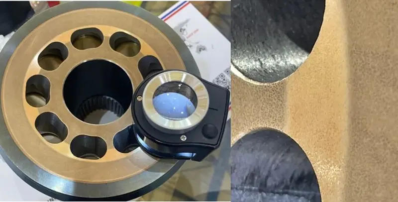 When the high-pressure oil in the cylinder block plunger cavity is discharged to the high-pressure window of the distributor plate, the clearance between the cylinder block spline and the main shaft spline, as well as the impact force on the slipper friction surface during the swashplate step (sudden change in tilt angle), cause radial bending of the main shaft. These three conditions result in a wedge-shaped gap flow between the high-pressure side distributor surface of the cylinder block and the distributor plate. The reaction force of the low-pressure window friction surface of the distributor plate and the cylinder block distributor plate, which is wedge-shaped, forms a dry friction between the metal in direct contact without an oil film. This localized dry friction between metals causes wear on the arc surface of the low-pressure end face of the distributor plate. However, due to the oil film effect of the wedge-shaped gap flow, there is no wear in the high-pressure area of the distributor plate. That is, the high-pressure area is intact, while the low-pressure arc surface is severely worn. This is the key characteristic for judging this type of failure mode.