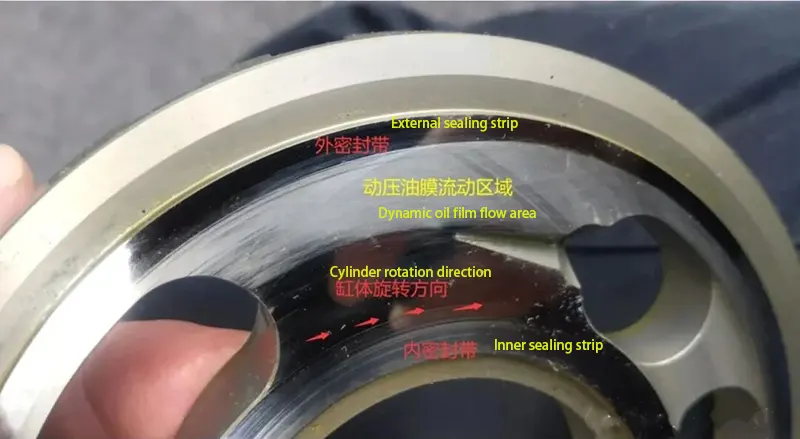 Action: Hydraulic oil in the high-pressure area of the cylinder is actively ejected to the low-pressure window area through the annular indentation (dynamic lubrication ring) on the cylinder's distribution surface.