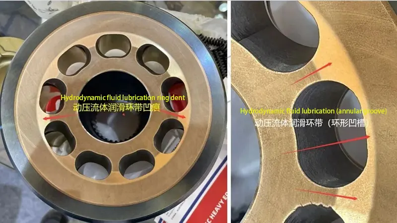 The "hydrodynamic fluid lubrication ring" indentation on the Kawasaki K5V plunger cylinder block is a precise engineering solution for asymmetric wear failure. By ejecting high-pressure oil and generating forced dynamic pressure, it constructs a stable fluid oil film in the low-pressure region, successfully solving the industry problem of "wear on the low-pressure side and integrity on the high-pressure side," representing a high level of lubrication design for the friction pair of axial piston pumps.